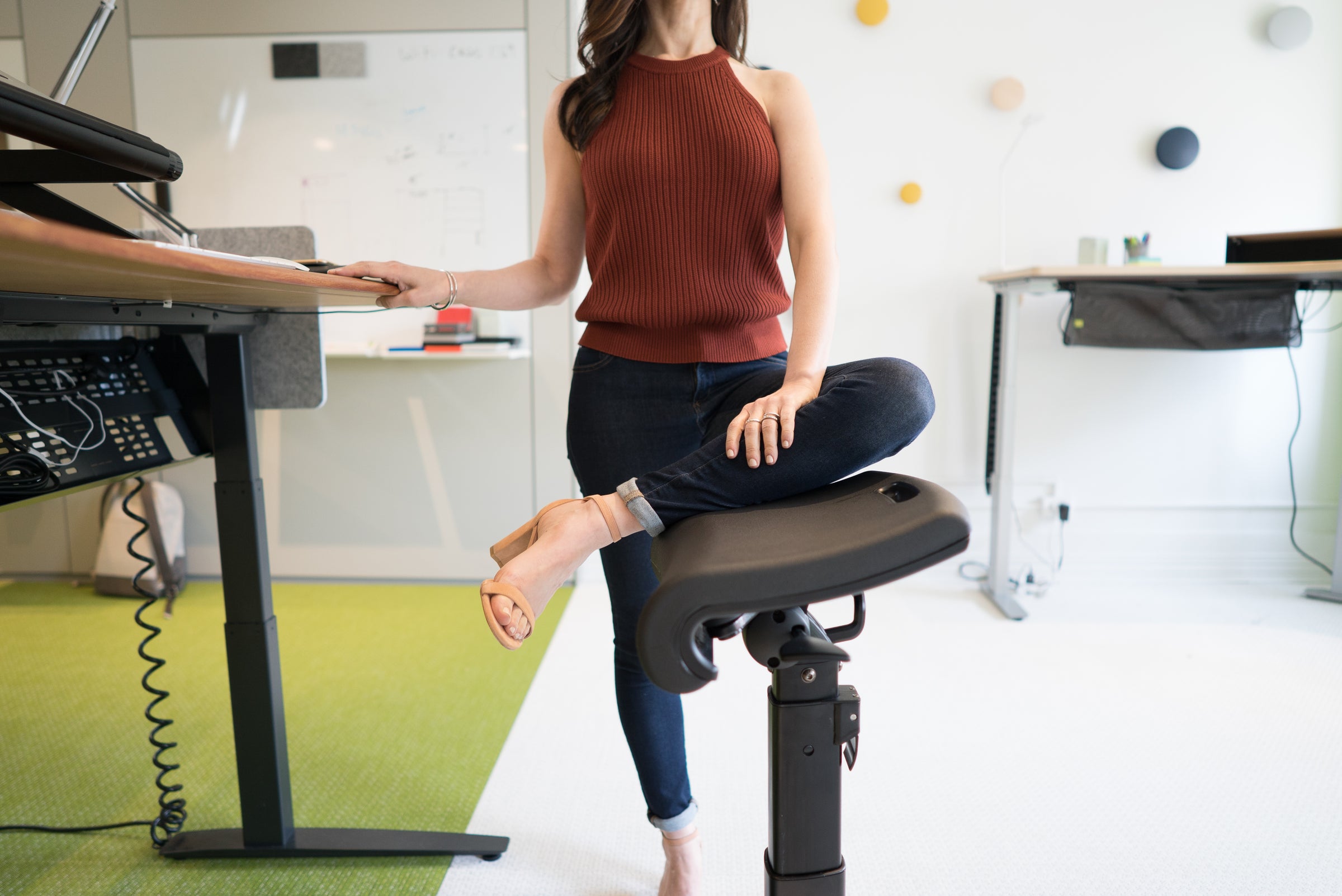 We're all designed a bit differently, so start out in a position that's comfortable for you and vary the setting throughout the day. You should be able to easily move the seat position from leaning, to perching, to sitting, and also move your knees and feet often. Through regular movement you will maintain the healthiest muscle structure and burn more calories. See our user manual, and our YouTube Video for examples of potential positions and corresponding healthy postures.